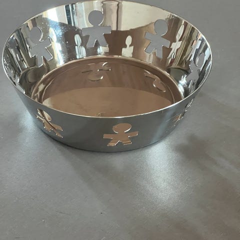 Alessi bolle i metall, rustfritt stål. Bollen har utskårne figurmotiver rundt kanten. Egner seg til servering av frukt, brød eller snacks, eller som dekorativ skål på bord eller benk.