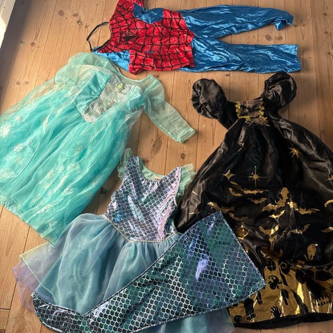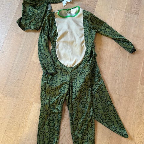 Dinosaurkostyme i størrelse 110 for barn. Heldrakt med hette, hale og tagger langs ryggen. Drakten er grønn med mørkere nyanser. Glidelås foran for enkel av- og påkledning. Passer til utkledning, karneval eller lek for barn ca. 4–5 år, avhengig av høyde og kroppsstørrelse.