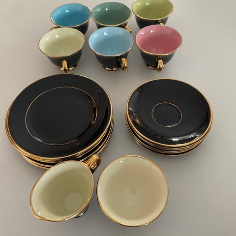 Stavangerflint klassisk ‘Palett’ svart kaffekopp med gullkant og fem skåler. Gulgrønn innside.