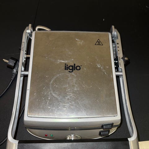 Braun bordgrill i sølv og svart. Grillen har rillede grillplater på innsiden, egnet til grilling av for eksempel sandwich, kjøtt, grønnsaker og annet grillmat på kjøkkenbenken. Elektrisk tilkobling med ledning. Ytre lokk i metallfarge og innside med mørke non-stick grillflater som er enkle å rengjøre. Passer til innendørs bruk på kjøkken eller hybelkjøkken der det er behov for en kompakt elektrisk grill.