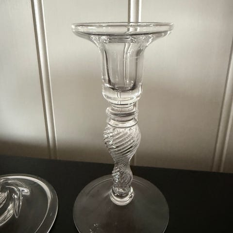 1 spesiell og MEGET FLOTT beholder med lokk i kraftig klart glass. En karaffel. Meget dekorativ. Høyden er 14,5cm med lokket. Høyde uten lokket er 11,5 cm. Bredde ca 8 cm. Åpningen øverst er 6,5 cm, veier 490 gram. Har et flott kraftig mønster på hele beholderen. Den er gammel, ca 60 år, og kjøpt i England. Se alle bildene. Karaffelen kan sendes, eller hentes her i Sandefjord, eller avtale henting i Tønsberg på Tolvsrød. Kan også sende med helthjem, koster kr. 82,-, inntil 5 kg! Forsikret og med sporing.