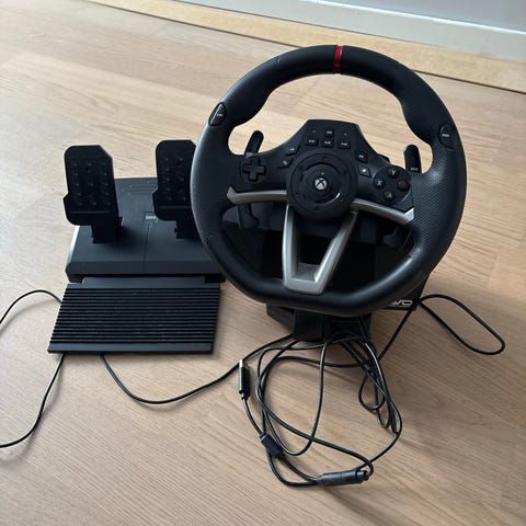 Sett for kjøresimulator som inkluderer ratt, pedalsett og separat kontrollpanel med mange knapper og brytere. Rattet har tre eiker og monteres på bord eller lignende. Pedalsettet består av to pedaler med bred fotplate. Kontrollpanelet har flere fargekodede knapper, vippebrytere, joystick og rullehjul for styring av ulike funksjoner i spill.