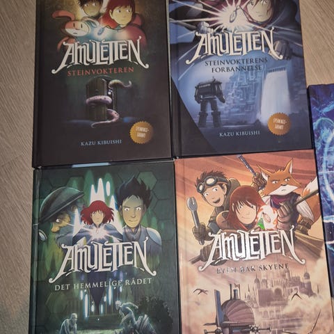 Kazu Kibuishi Amuletten tegneseriebøker på norsk. Samling med flere bøker i serien, blant annet titler som «Steinvokteren», «Steinvokterens forbannelse», «Byen bak skyene», «Det hemmelige rådet» og «Flukten fra Lucien». Bøkene er illustrerte grafiske romaner i albumformat, innbundet, med fargerike omslag. Egner seg som lesestoff for barn og unge som liker fantasy og tegneserier.