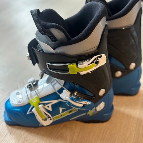 Nordica Team T3 alpinstøvler for barn i størrelse 225 mm (ca. 20,5). Støvlene er i svart og blå farge med detaljer i sølv og gul. Modellen har 2 justerbare spenner i metall og plast for god tilpasning rundt fot og legg. Myk, polstret innersko gir komfort og støtte til barneføtter. Passer til vanlig alpinbinding for barn.