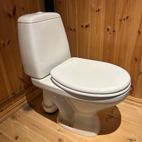 Gulvstående toalett i hvit porselen. Toalettet har sisterne med toppmontert trykknapp for nedspyling og standard toalettsete med lokk. Egnet for montering på bad eller toalettrom med gulvavløp. Passer som erstatning for eksisterende gulvstående toalett i tilsvarende standard utførelse.