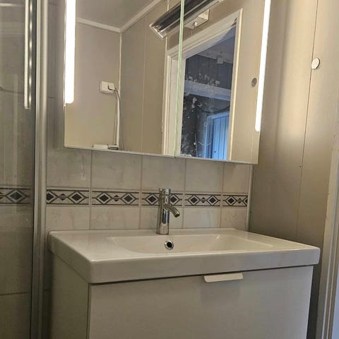 Baderomsinnredning med servantskap og speilskap i tredekor og hvit servant.
