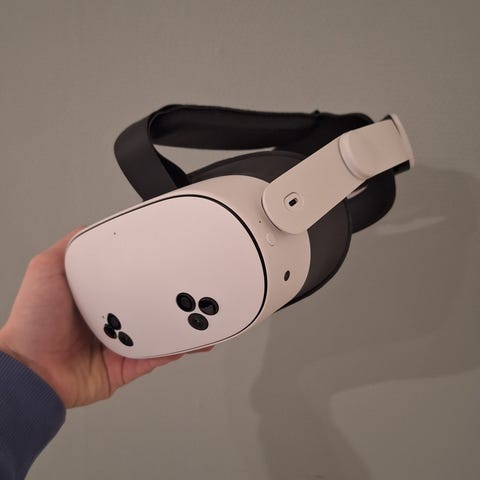 VR-headset. Hodebåndet er utformet for å gi bedre vektfordeling og mer stabil passform under bruk. Den integrerte batteripakken forlenger brukstiden sammenlignet med standardstroppen.