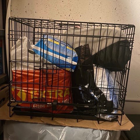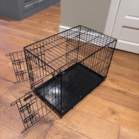 Hundebur i metall med myk pute i bunnen. Buret har gitterkonstruksjon som gir god lufting og oversikt for hunden. Egnet som soveplass eller oppholdsplass for hund i hjemmet eller på reise. Kan plasseres på gulv, hylle eller i bil, avhengig av størrelse og behov. Tekstiler og tepper på bildet kan brukes som ekstra polstring og komfort for dyret.