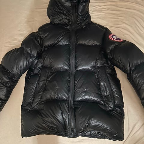 Canada Goose dunjakke for herre i størrelse S. Jakken er grå og fylt med dun. Den har hette, gjennomgående glidelås i front og glidelåslommer i siden. Egner seg som ytterjakke eller mellomlagsjakke i kjøligere vær.