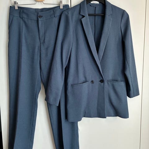 Monki dressbukse og blazer for dame i størrelse XS. Sett i blå polyester med rutemønster. Blazeren har enkel knepping foran, jakkeslag og lommer. Buksen har rett passform. Egner seg til bruk som dressett til hverdag eller mer formelle anledninger. 500kr for settet eller 300kr per del