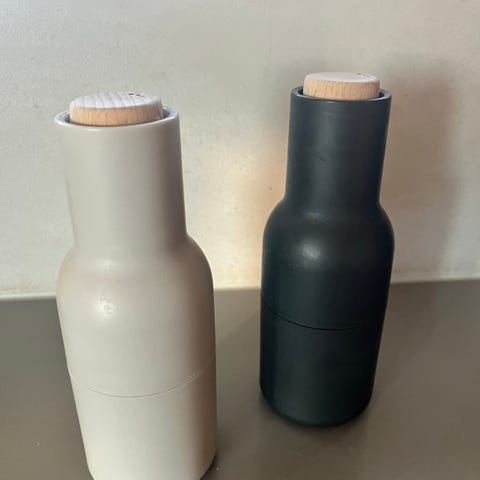 Bottle Grinder salt og pepperkvern fra Audo Copenhagen er en elegant og praktisk kvern med en form som forener funksjon og design i harmonisk balanse. Den flaskformede silhuetten, skapt av Norm Architects, har en myk silikonlignende overflate som ligger behagelig i hånden. Kvernen fylles enkelt på ved å åpne og lukke den på midten, og takket være kvernverket i toppen unngår du søl på kjøkkenbenken. Det kraftige keramiske maleverket håndterer alt fra salt og pepper til frø og tørket frukt, og grovheten justeres smidig med vredet øverst. Bottle Grinder salt og pepperkvern fra Audo Copenhagen er like vakker som funksjonell – et designikon i det moderne kjøkkenet