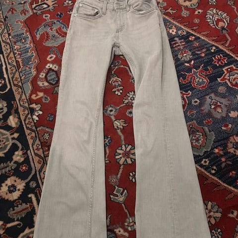 Gina Tricot Perfect Jeans damejeans i blå denim. Buksen er i størrelse 34. Materiale i bomull. Klassisk 5-lommers modell med knapp og glidelås i gylf. Jeansen har slitte og hullrike partier foran på begge ben, samt noe slitasje ellers, slik det fremgår av bildene. Egnet som hverdagsbukse eller til en mer avslappet stil.