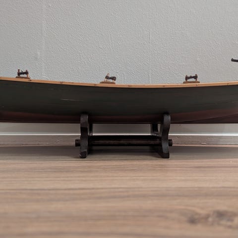Seilbåt modell i tre med seil på sokkel. Modellen har skrog i tre med mørk blå bordgang og naturlig treverk i kjøl og dekk. Båten står på en enkel trebunn/sokkel som gjør den egnet som dekorasjon på hylle eller bord. Seilene er i lyst tekstil og riggen er detaljert med master og tauverk. Passer som maritim pyntegjenstand i hjem, hytte eller kontor.
