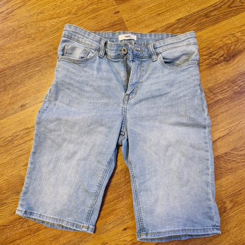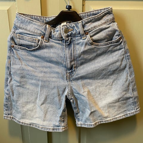 H&M denimshorts for dame i grå/blå vask, størrelse 34. Shortsen er laget av bomull og har klassisk 5-lommers design med beltehemper, knapp og glidelås i front. Modellen har slitte detaljer og frynsete kant nederst. Passer til hverdagsbruk i varme sesonger.