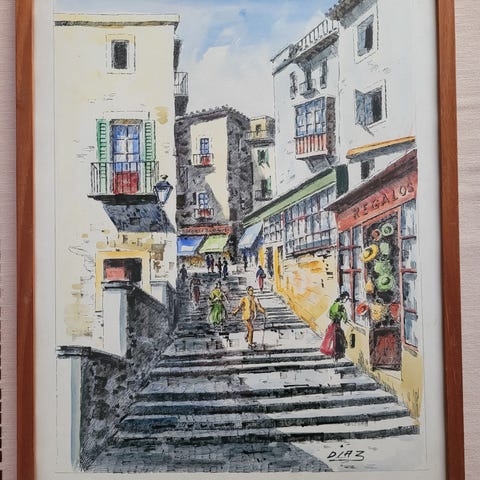 Ramme med fotokunst i hvit utførelse. Bildene viser ulike motiver fra by- og kystmiljø, blant annet smale gater, hus ved sjøen, scooter ved husvegg og bil ved strandpromenade. Hver plakat er montert i hvit ramme med passepartout. Egner seg som veggdekor i stue, gang, soverom eller kontor.