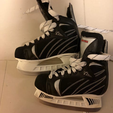 Ultra ishockeyskøyter for barn i størrelse 28. Skøytene har klassisk snøring, svart og hvit overdel og fastmontert skøytestål. Egnet til ishockey og generell skøytebruk for barn på isbaner og skøytebaner.