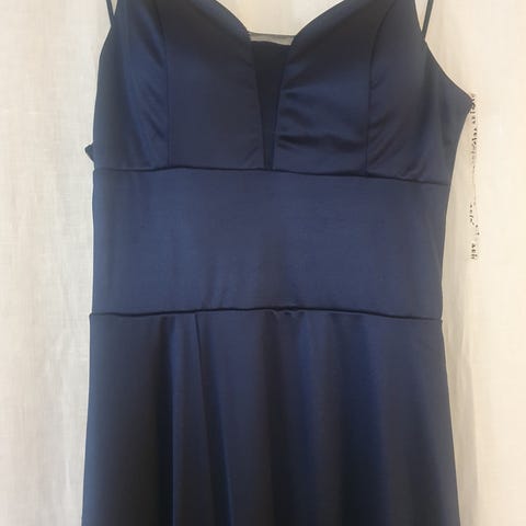 Alexandra Ritzi ballkjole, kort, i størrelse 38. Kjolen er laget i silke og har en mørk blå farge. Modellen har smale stropper og innsvinget overdel. Baksiden har glidelås langs overdelen.