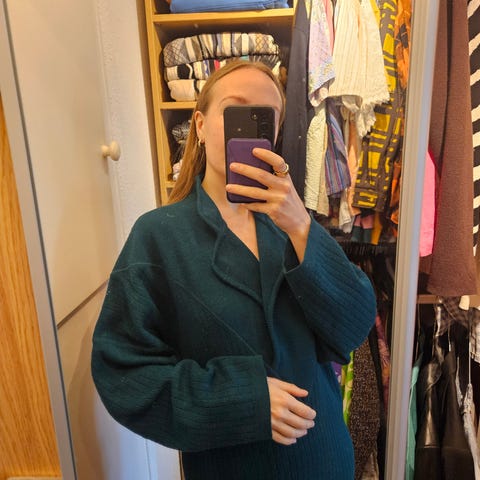 Jeg kjøpte denne kjolen på Fretex, men har selv bare brukt en gang. Den har nydelige farger og personlighet. Trolig hjemmestrikket kjole. Litt usikker på materiale, men er nok noe ull. Veldig komfortabel og stretchy, så vil si den kan passe en S-L. Vær obs på at den har litt hull noen steder, og løse tråder.