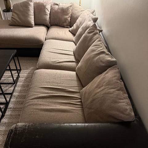 Brukt hjørnesofa gia bort. Er i to deler som skyves sammen til hjørnesofa. Delene er brukt som gjestesenger. Hver del er litt under 2 meter lang. God å ligge i, god å sitte i. Må hentes i Spjelkavika. Ta med egen bærehjelp.