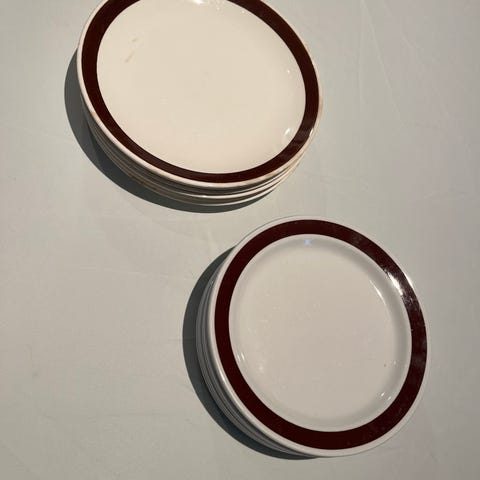Tre har forhøyet kant, diameter 25,5 cm. Disse er lite brukt og har klare farger. 500kr pr stk