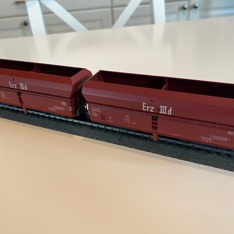 Settet inneholder et lite lokomotiv, flere godsvogner og buede skinner som kan settes sammen til en rundbane. Det følger med elektrisk transformator med regulering for kjøring av toget. Delene ligger i original isoporeske med tilpassede rom til skinner, tog og trafo.