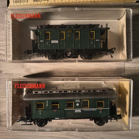 Fleischmann HO startsett modelljernbane med lokomotiv, godsvogner, skinner og transformator.