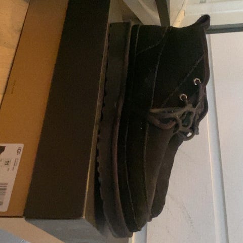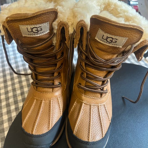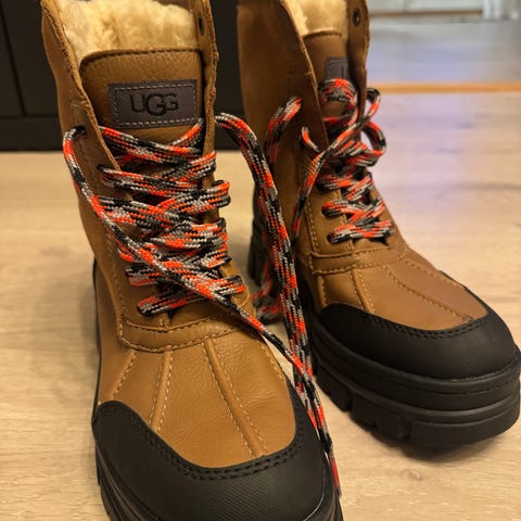 UGG vinterstøvler i størrelse 44. Modellen er vanntett og har overdel i brunt skinn og tekstil. Støvlene har snøring foran for justering av passform og mykt fôret innvendig skaft for ekstra varme. Egnet som varme og robuste vinterstøvler til bruk i kaldt og vått vær.