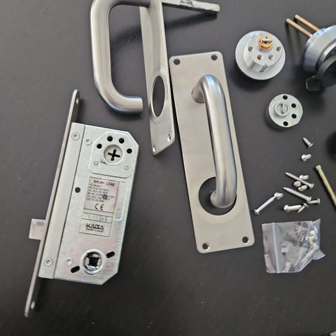 Assa Abloy dørlåssett med sylinder og dørhåndtak i stål. Settet inneholder låskasse, sluttstykke, sylindere, nøkler, dørhåndtak og tilhørende festedeler. Passer til montering i dør der det er behov for komplett låseenhet med både innvendig og utvendig betjening. Materialet fremstår som børstet stål/metall, egnet for innvendige eller eventuelt utvendige dører avhengig av spesifikasjonene til låskassen og sylinderen. Helt ny - levert i ny dør, men skiftet umiddelbart pga montering av kodelås.