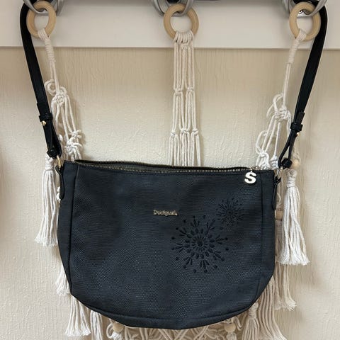 Desigual skulderveske i kunstlær for dame. Vesken har et lyst underlag med blomstermønster og glidelåslukking på toppen. Innvendig er den fôret og har en mindre glidelåslomme til nøkler, mobil eller andre småting. Utenpå er det en ekstra lomme med glidelås. Kort skulderrem gjør at vesken kan bæres på skulderen eller i hånden. Egnet til hverdagsbruk eller som en liten veske til enkle nødvendigheter. Som ny, se bilder for nypris.
