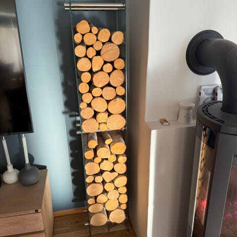 Vedstativ i metall og glass i svart utførelse. Rektangulær, åpen konstruksjon med topp- og bunnplate i metall og sideplater i glass. Egnet til oppbevaring av ved ved peis eller ovn innendørs. Stativet gir oversiktlig lagring av vedkubber og kan plasseres inntil vegg eller i et hjørne etter behov.