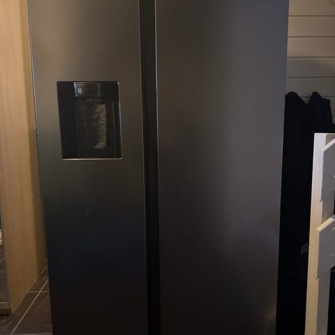 Kjøleskapet har to dører med separat kjøle- og frysedel plassert side om side. Fronten har integrert vann- og isdispenser med elektronisk betjeningspanel og digital temperaturvisning. Innvendig er det flere glasshyller, dørhyller og skuffer for organisering av matvarer, inkludert egne skuffer nederst i kjøledelen. LED-belysning gir god oversikt i skapet.