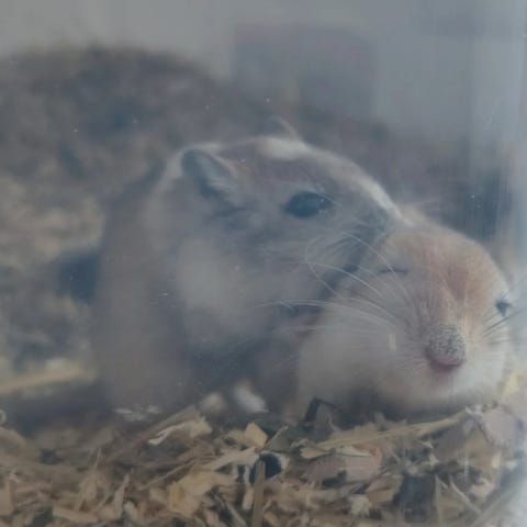 De er to hanner, og sammen med dem kommer et spesiallagd bur med et stort utvalg av aktiviteter både i tre og plast og ekstra deler til variasjon eller ombygging. Utenom dette medfølger selvfølgelig strø, mat og sand. De er morsomme å leke med.