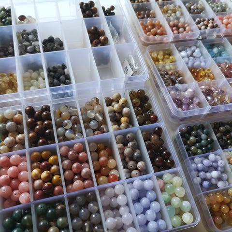 Diverse smykkedeler og perler i blandede farger og størrelser. Inneholder ulike typer perler, metallkomponenter, kjeder, låser, tråd og snor, samt små oppbevaringsbokser og poser. Egnet til hobbybruk og egenproduksjon av smykker som armbånd, halskjeder og øredobber. Innholdet er assortert og kan variere i form, materiale og mengde.