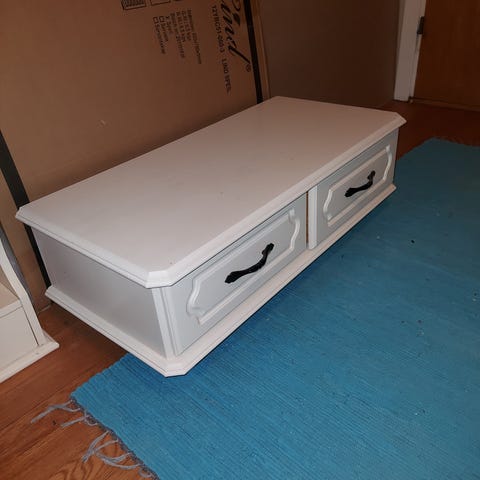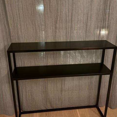 Jysk konsollbord i tre og hvitmalt utførelse. Bordplaten er i beiset treverk, mens understell og skuffer er hvitmalt. Møbelet har to skuffer med håndtak i metall og en åpen hylle under for ekstra oppbevaring eller plassering av dekor. Egnet som konsollbord i gang, stue eller andre oppholdsrom.