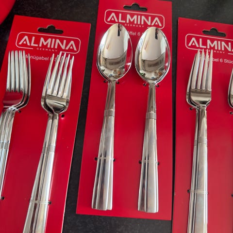 Hvertfall 10 stk av hver i stål spiseskje, teskje, gaffel og kniv, pluss litt ekstra....