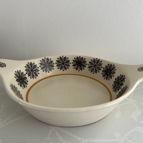 Selger en flott ildfast skål fra Stavangerflint, Selbu til kr 130,- + porto. Høyde 6 cm. Diameter 15,5 cm. Bredde med ører 22 cm. Veldig flott skål med flott mønster ❄️