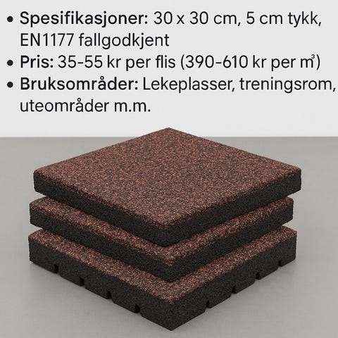 I forbindelse med oppussing av treningsareal selges et større antall fallgodkjente gummifliser i størrelse 30×30×5 cm. Dette er robuste, EN1177-sertifiserte fliser som egner seg perfekt til treningsområder, lekeplasser, garasje, verksted og uteområder med behov for støtdemping og slitestyrke.