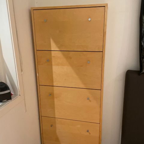 Praktisk og tidlaust skoskap frå IKEA i kvit utføring. Har tre rom med god plass til sko, og tek lite plass i gangen. Normal bruksslitasje, men i god stand og fullt brukbart.
