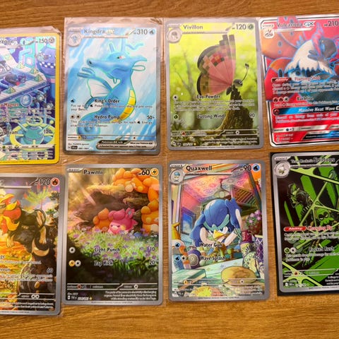 Pokémon TCG samlekort med flere ulike kort vist på bildene.