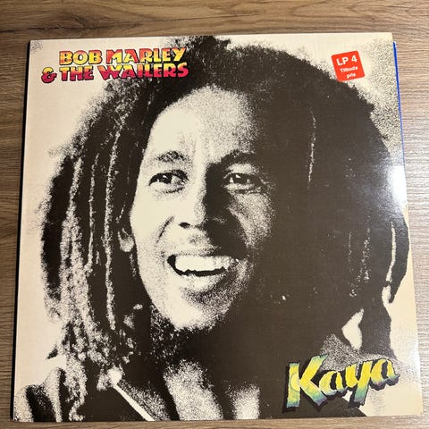 Bob Marley & The Wailers Kaya vinylplate. Albumet er utgitt på LP og kommer med originalt cover med trykt albumtittel, artistnavn og sangtekster på baksiden. Coveret viser noe slitasje og misfarging, spesielt i hjørnene. Passer for avspilling på platespiller som støtter 12" LP-plater.