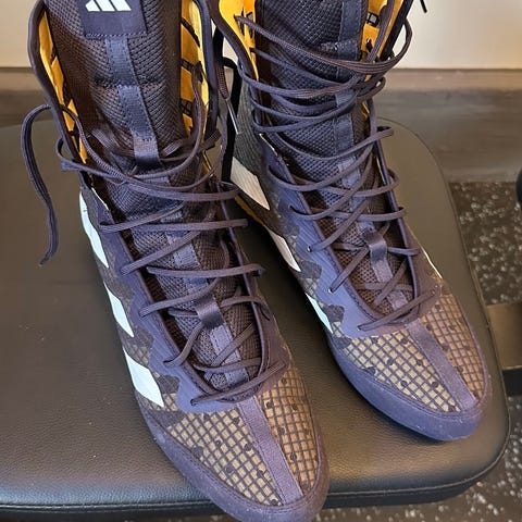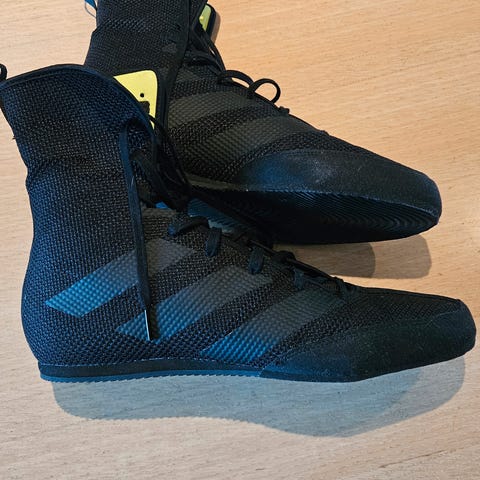 Adidas boksesko i høy modell. Skoene er hvite med blå striper og blå lisser, samt oransje detaljer rundt skaftet og hælen. Yttersålen er flat med mønster for godt grep på underlaget. Overdelen er i lett materiale med snøring hele veien opp for god støtte rundt ankelen. Egnet til bruk på boksing eller annen kampsport på innendørs underlag.