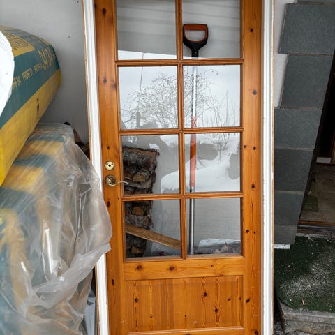 Innerdør med flere glassfelt i øvre del og hel fylling i nedre del. Døren er malt hvit og har klassisk profilert ramme. hengsler på siden som vist på bildene. Passer som innvendig dør mellom rom der man ønsker lysgjennomgang samtidig som man beholder en tradisjonell stil.