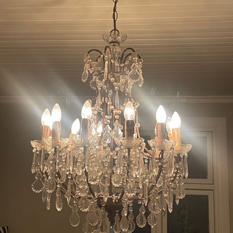 Selger en utrolig fin, kvalitets pendellampe/ lysekrone som egner seg best over spisebord eller i stua. Lampen er i stål.