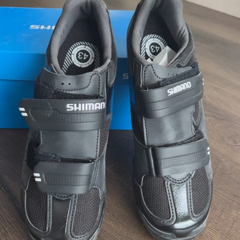 Shimano sykkelsko i størrelse 41. Modellen er svart og har borrelås- og spennelukking over vristen for god tilpasning. Overdelen har perforerte felt for ventilasjon. Egnet til bruk med klikkpedaler på sykkel, både til trening og turbruk, avhengig av kompatible cleats og pedaler.