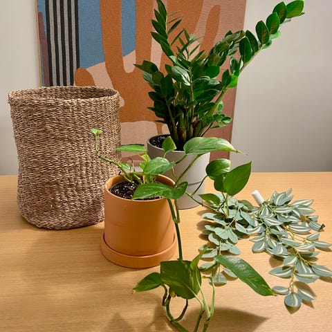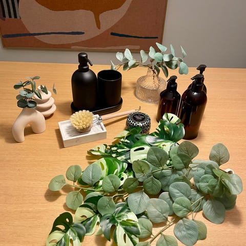 Interiørpakke med kunstige planter, blonsterpotter. lysestaker, lampe og pynt til kjøkken.