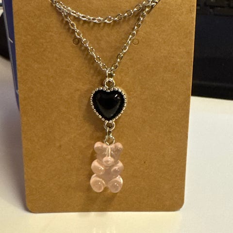 Halskjede med hjerte anheng i glass. Halskjede er i syntetisk imitert skinn.