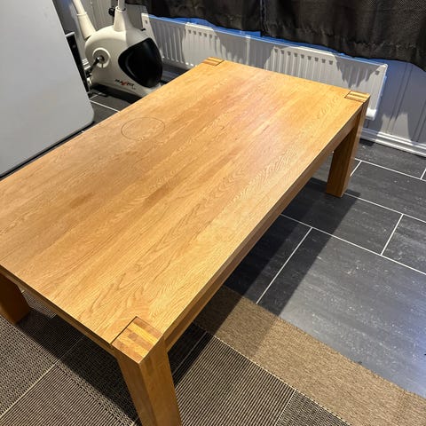 ,Nydelig bord i eik. Trengs å pusses oppå så blir det som nytt igjen. Her får du et stabilt bord som tåler det meste.