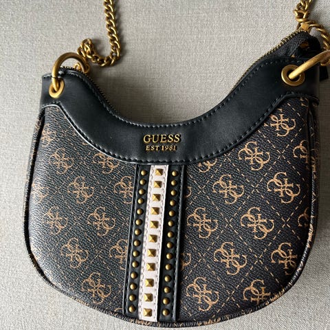 Guess skulderveske for dame i svart kunstlær. Vesken har preget logomønster på utsiden og justerbar skulderrem kombinert med lenkedetaljer i metall. Innvendig har vesken hovedrom med glidelåslomme og mindre lommer for organisering av småting. Lukkes med klaff og trykknapp. Egnet tl å gå ut medog enklere anledninger der det er behov for en liten veske til det viktigste.