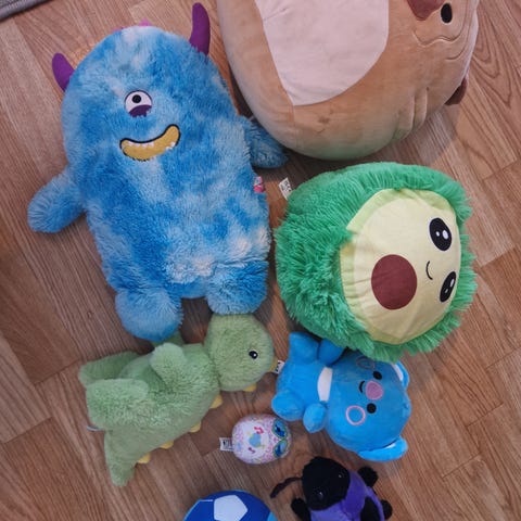 myke kosedyr bamser i ulike farger. Fire bamser med forskjellige ansiktsuttrykk og farger, laget av mykt materiale. Passer som leker eller dekorasjon for barn.