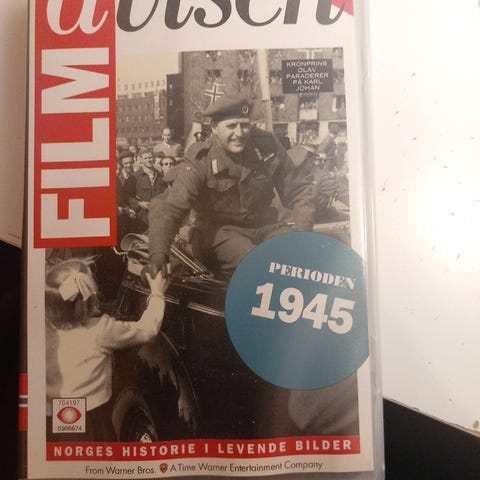 Warner Home Video Filmavisen VHS periode 1945. Videokassett med nyhetsinnslag fra Filmavisen som dekker hendelser i Norge i 1945. Inneholder historiske filmopptak fra perioden rett etter andre verdenskrig, presentert som korte reportasjer i svart-hvitt. Format: VHS. Produsert og utgitt av Warner Home Video i samarbeid med Norsk Film A/S.